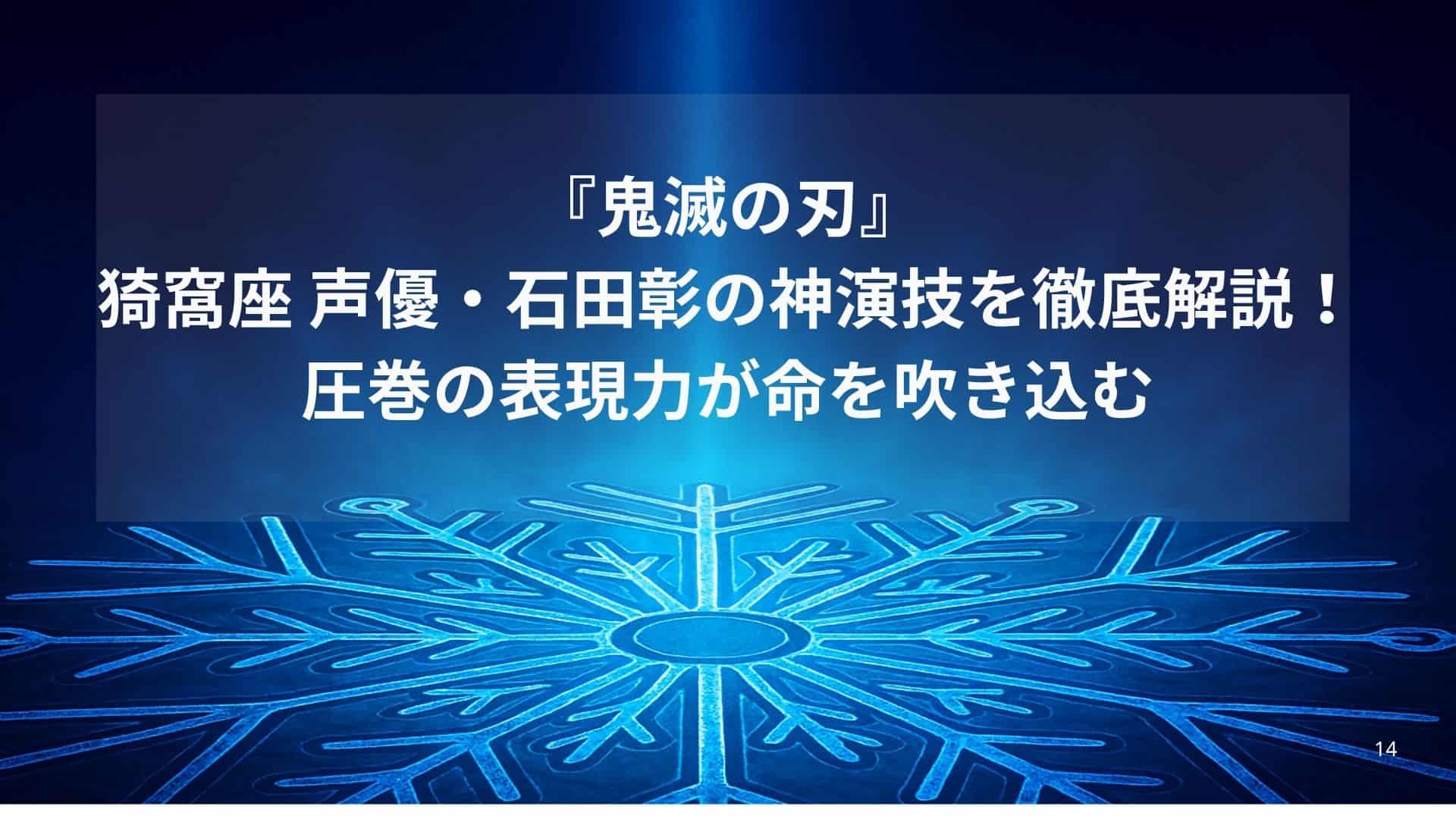 アニメ『鬼滅の刃』上弦の参・猗窩座(あかざ)を演じる声優・石田彰さん。その圧倒的な表現力と唯一無二の“神演技”によって、猗窩座というキャラクターの魅力はさらに輝きを増しています。本記事では、石田彰さんの猗窩座役がなぜここまで絶賛されているのか、SNSの反応や過去作品での評判も交えて徹底解説します。