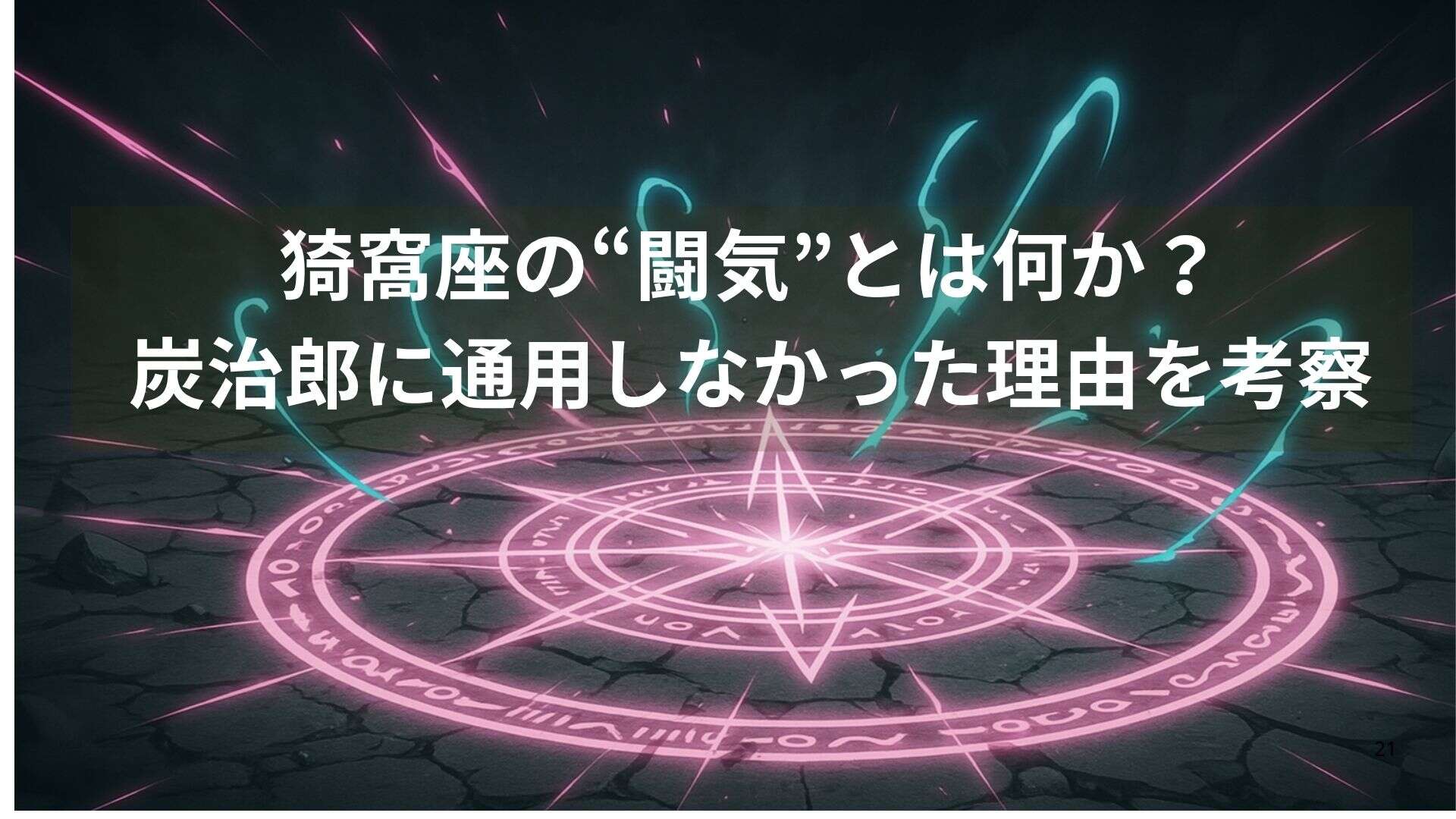 『鬼滅の刃』における上弦の参・猗窩座(あかざ)は、術式展開・羅針によって敵の“闘気”を読み取るという、極めて特殊な戦い方をする鬼です。しかし物語後半、炭治郎との決戦においてその能力が通用しない瞬間が描かれ、多くのファンに衝撃を与えました。この記事では、そもそも「闘気」とは何か、そしてなぜ炭治郎には通じなかったのかを掘り下げて考察していきます。