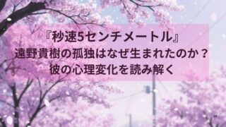 『秒速5センチメートル』は、ただ美しい映像と切ない物語で構成された作品ではありません。その核心には、主人公・遠野貴樹の繊細で複雑な心理変化が描かれています。彼は、篠原明里との別れを経験した後、人生の様々な局面で孤独を深めていきます。なぜ、彼...