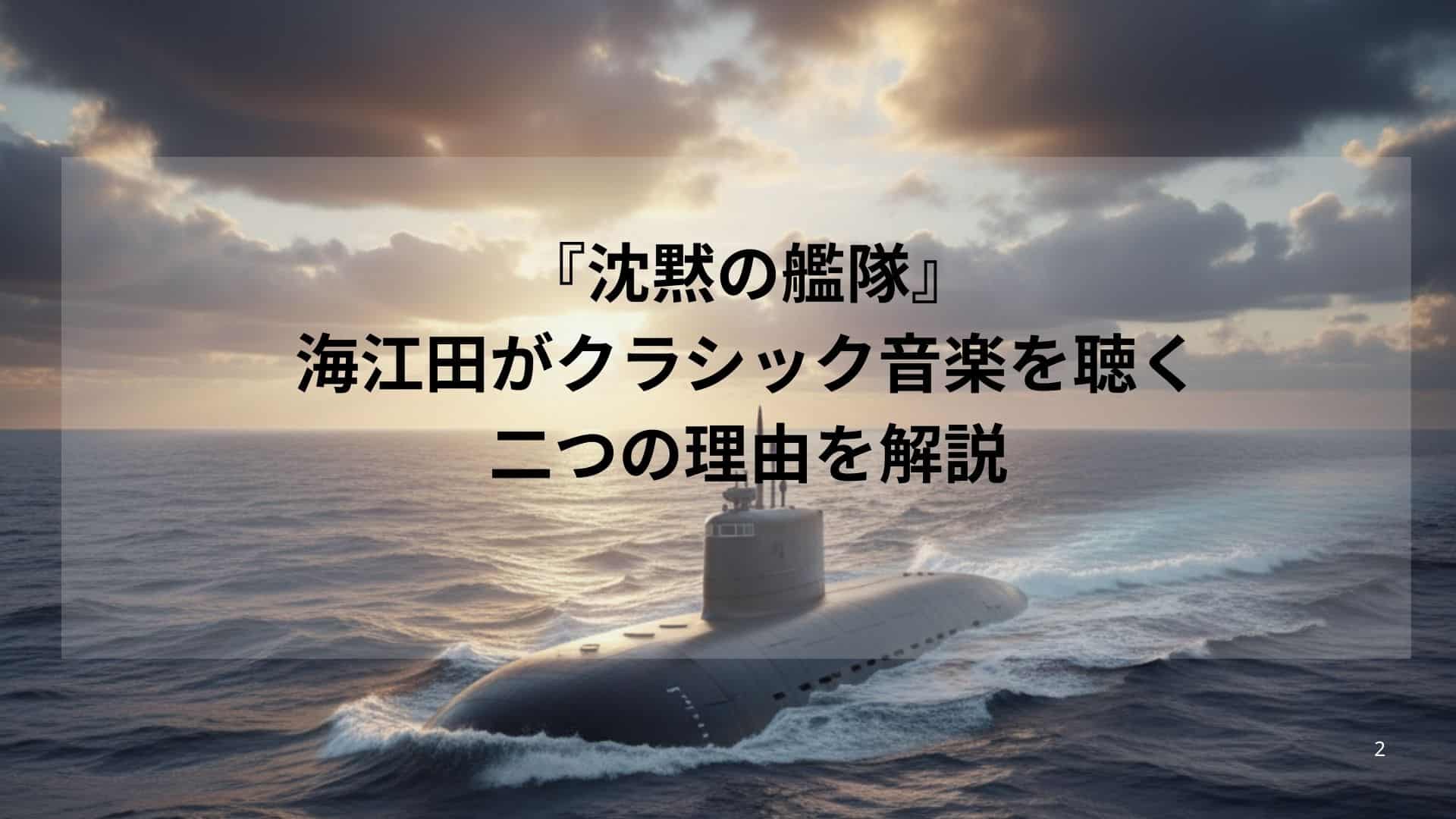クラシック音楽は、海江田の精神世界を表現するだけでなく、敵を欺くための戦略兵器としても使用されています。海江田は、海中にクラシック音楽を流すことで、敵のソナーを攪乱し、追跡を回避します。