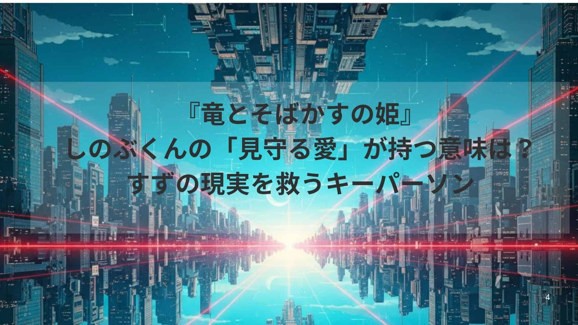 竜とのファンタジックなロマンスが注目されがちですが、物語の最終的なテーマである「現実での救済と成長」を達成するために、しのぶくんの存在は不可欠でした。ここでは、彼がすずへ抱く感情と物語における重要な役割を考察します。